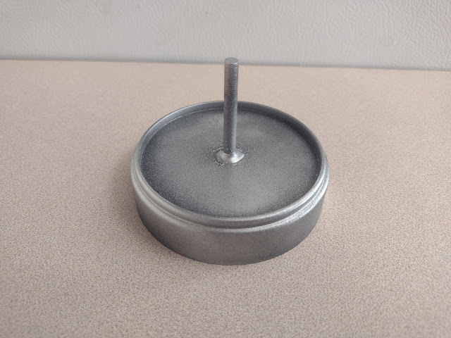 2. On a newspaper-lined surface in a well-ventilated area, build up layers of black and metallic silver spray paint to give the base and dowel the look of steel. It works best to apply a base coat of black followed by sliver, working in quick bursts to allow parts of the black to remain visible. You can also touch up portions with additional blasts of black if the silver becomes too heavy.